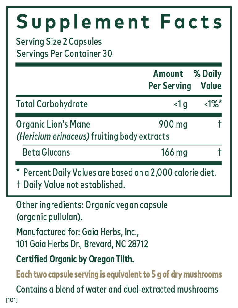 - Each serving = 5,000 mg dried Lion’s Mane mushroom