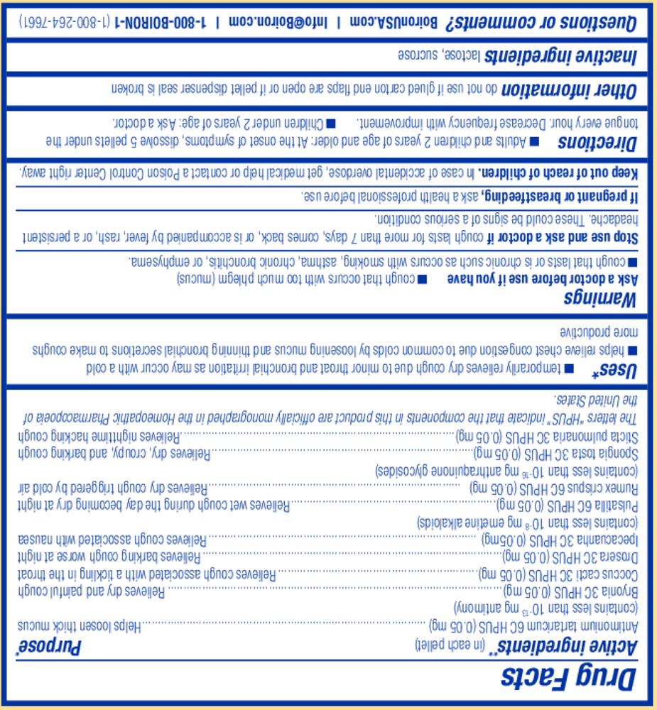 Active Ingredients: Antimonium tartaricum 6C HPUS (contains less than 10-13 mg antimony) 0.05 mg (Helps loosen thick mucus), Bryonia 3C HPUS 0.05 mg (Relieves dry and painful cough), Coccus cacti 3C HPUS 0.05 mg (Relieves cough associated with a tickling in the throat), Ipecacuanha 3C HPUS (contains less than 10-8 mg alkaloids) 0.05 mg (Relieves cough associated with nausea), Pulsatilla 6C HPUS 0.05 mg (Relieves wet cough during the day becoming dry at night), Rumex crispus 6C HPUS (contains less than 10-16 mg anthraquinone glycosides) 0.05 mg (Relieves dry cough triggered by cold air), Spongia tosta 3C HPUS 0.05 mg (Relieves dry, croupy, and barking cough), Sticta pulmonaria 3C HPUS 0.05 mg (Relieves nighttime hacking cough)
