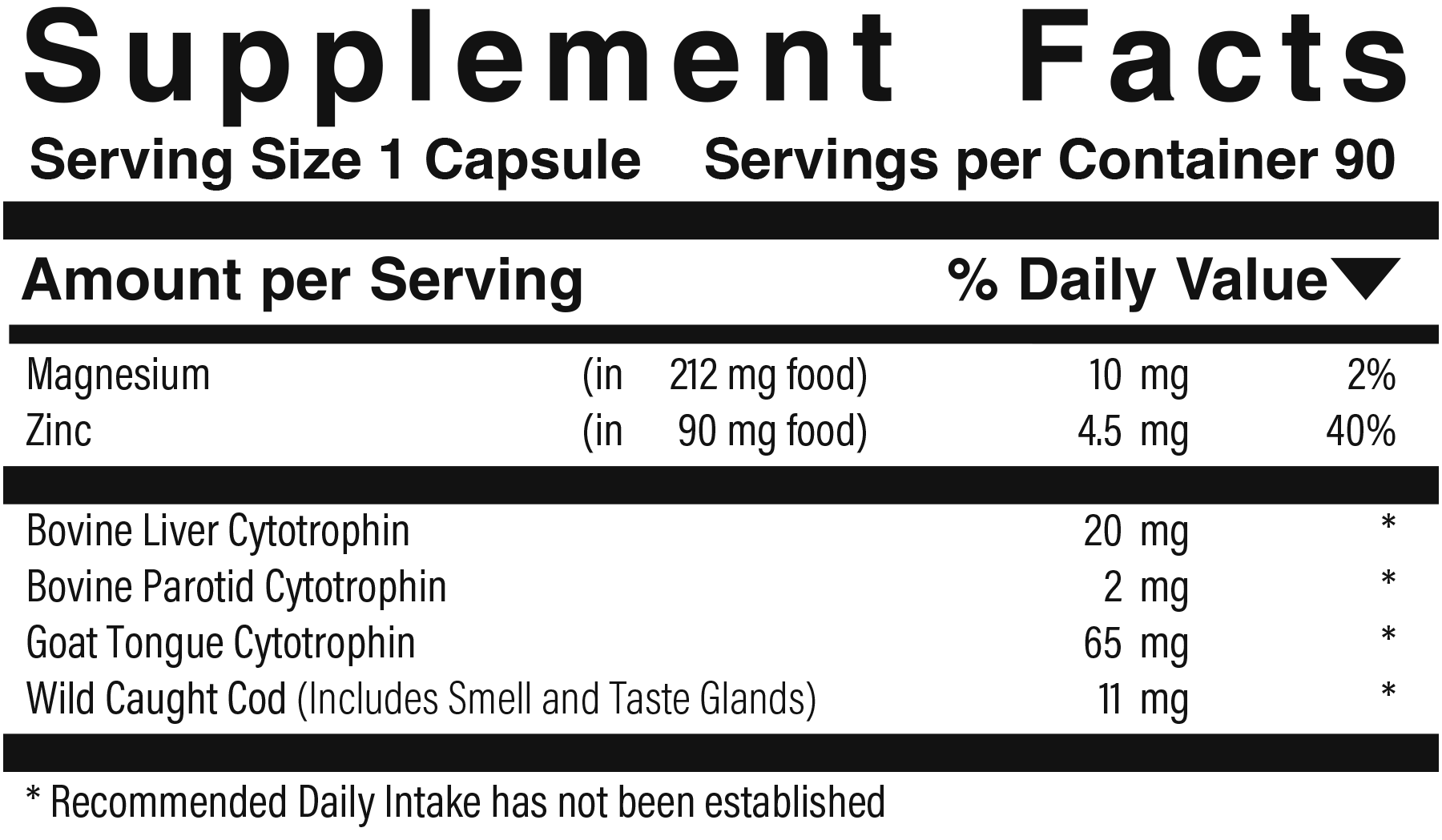 Complete Smell & Taste™ contains goat tongue and olfactory tissues which contain proteins and other nutrients found in properly functioning taste and smell receptors. Parotid glands support the salivary process and the health of the glands.