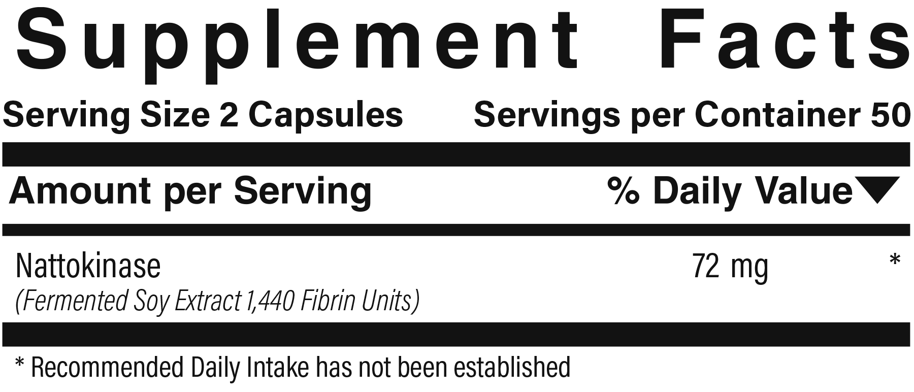 Nattokinase™ is a 100% vegan Food supplement that is intended to supply nutrients needed to provide high quality vegan nattokinase. Nattokinase is considered to be a fibrinolytic enzyme. It is capable of directly activating pro-urokinase (endogenous) and decomposing fibrin. Nattokinase assists in the body's fibrinolytic activity, supports cadiovascular health, and supports heart circulation.