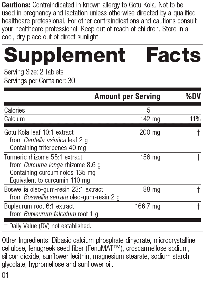 Each tablet is standardized to contain 67 mg curcuminoids (providing 55 mg of curcumin) and 20 mg of Gotu Kola triterpenes to ensure optimal strength and quality.