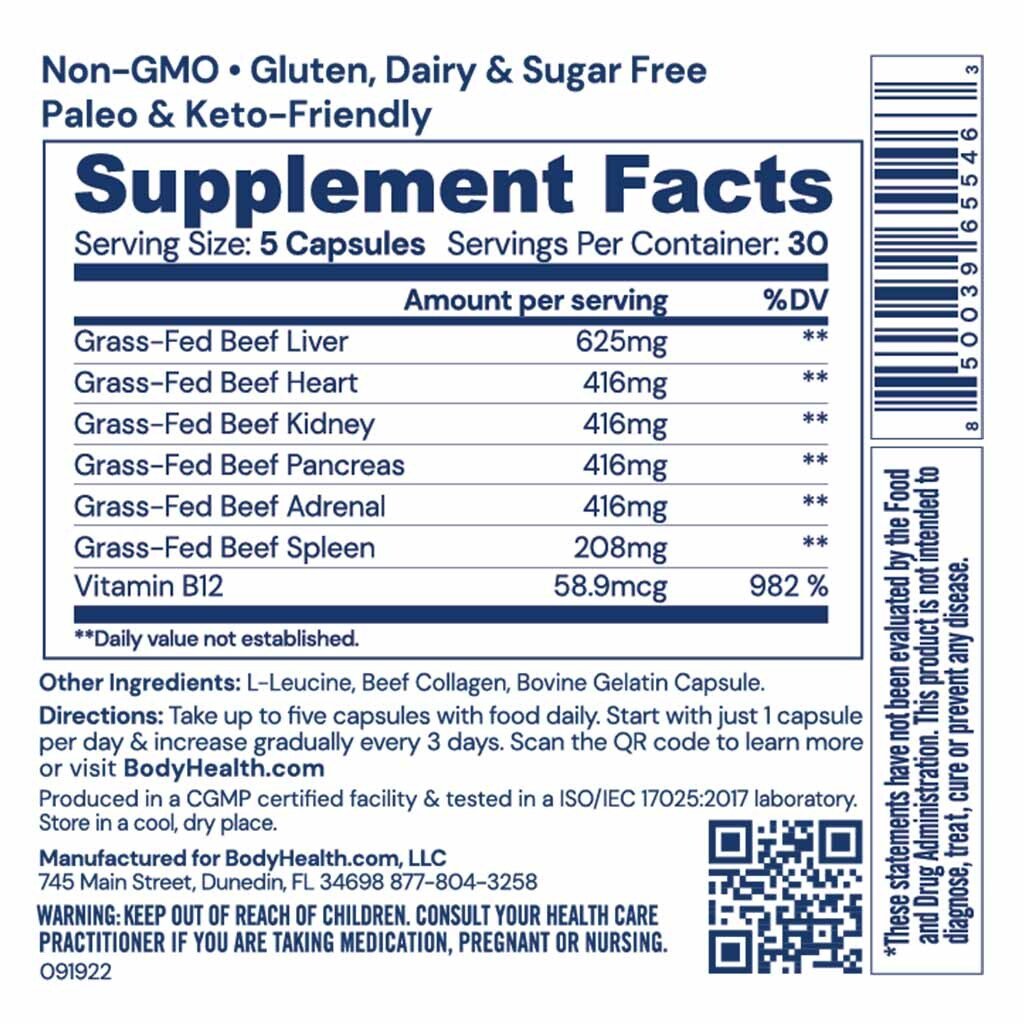 An easy-to-take supplement containing 6 of nature€™s most power-packed superfoods to give you the energy to live your life to the fullest. Forget about cooking (and tasting€¦!) liver, heart, and other beef organs €“ now you can use them to supercharge your body in a quick, easy, capsule form to boost your energy levels, enhance your immune system function, increase blood flow, boost heart health, and stimulate brain health!